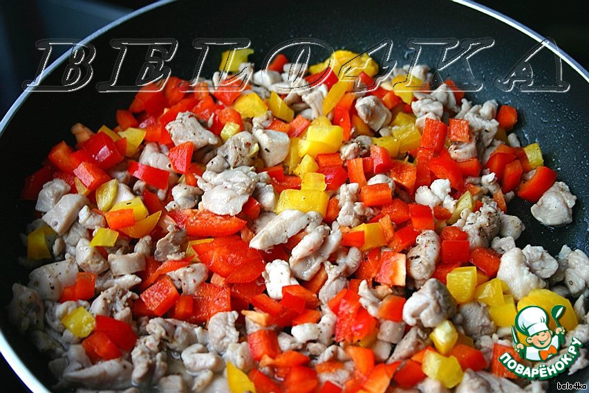Перец нарезать кубиками, добавить к курице, тушить в течение 10 мин.