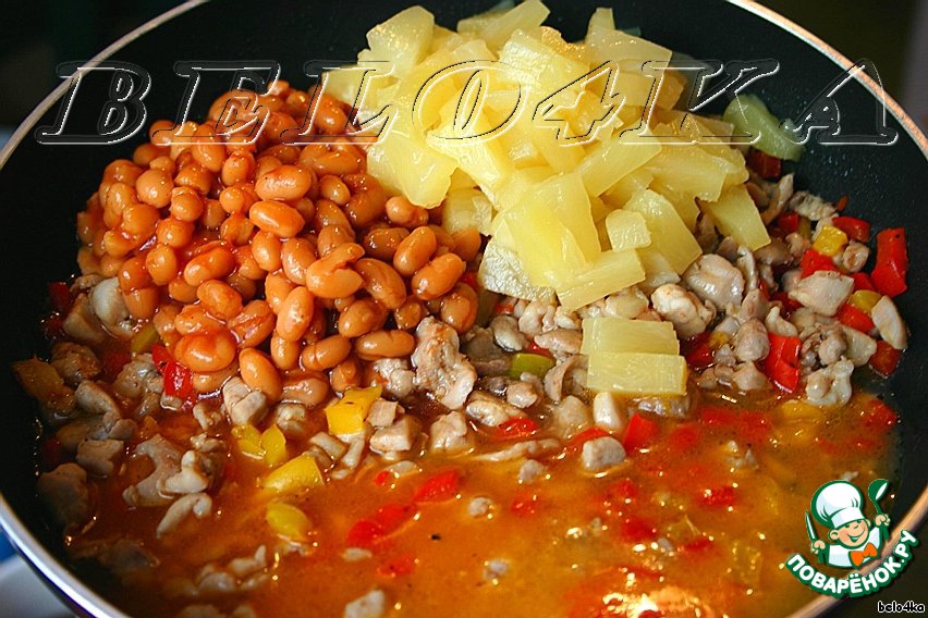 Положить в сковороду банку фасоли, ананасы с жидкостью,