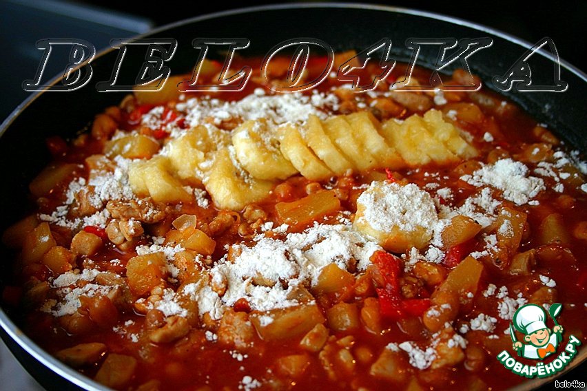 Перед окончанием приготовления положить к курице и овощам нарезанный банан и муку, перемешать, посолить во вкусу и оставить на плите еще 2 мин.