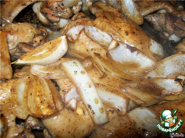 Ладно, к рецепту возвращаемся, по поводу лука. Его можно рассматривать только как составляющую маринада. Перед жаркой выбросить. А если лук любите, то жарьте вместе с курицей. Получается сладкий и хрустящий. Я люблю и жарю вместе.