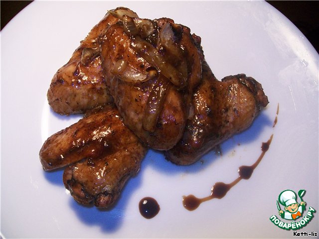Разогреть духовку до 200 град. Выложить в подходящую посудину курицу и залить маринадом, лук выложить сверху. Запекать в духовке приблизительно час. При этом периодически поливая выделяющимся соком. Когда увидите, что сок от крылышек стал тягучим, то пора вынимать.