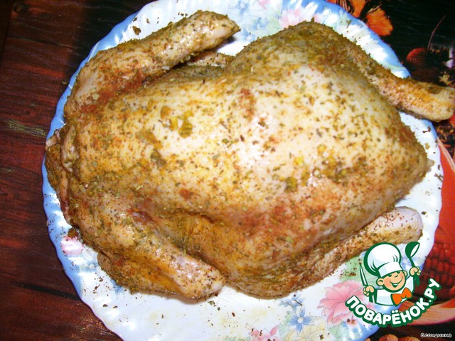 Натираем нашу курочку специями и чесноком, пропущенным через пресс.