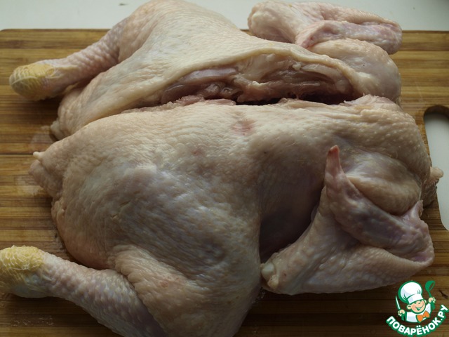 Курицу разрезаем по спинке – таким образом в мясе грудки останется больше сока.