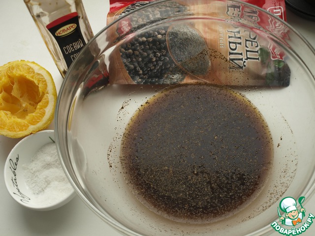 Из апельсина выдавливаем сок, смешиваем его с соевым соусом, добавляем чёрный молотый перец, немного соли (соус уже соленый), перемешиваем маринад.