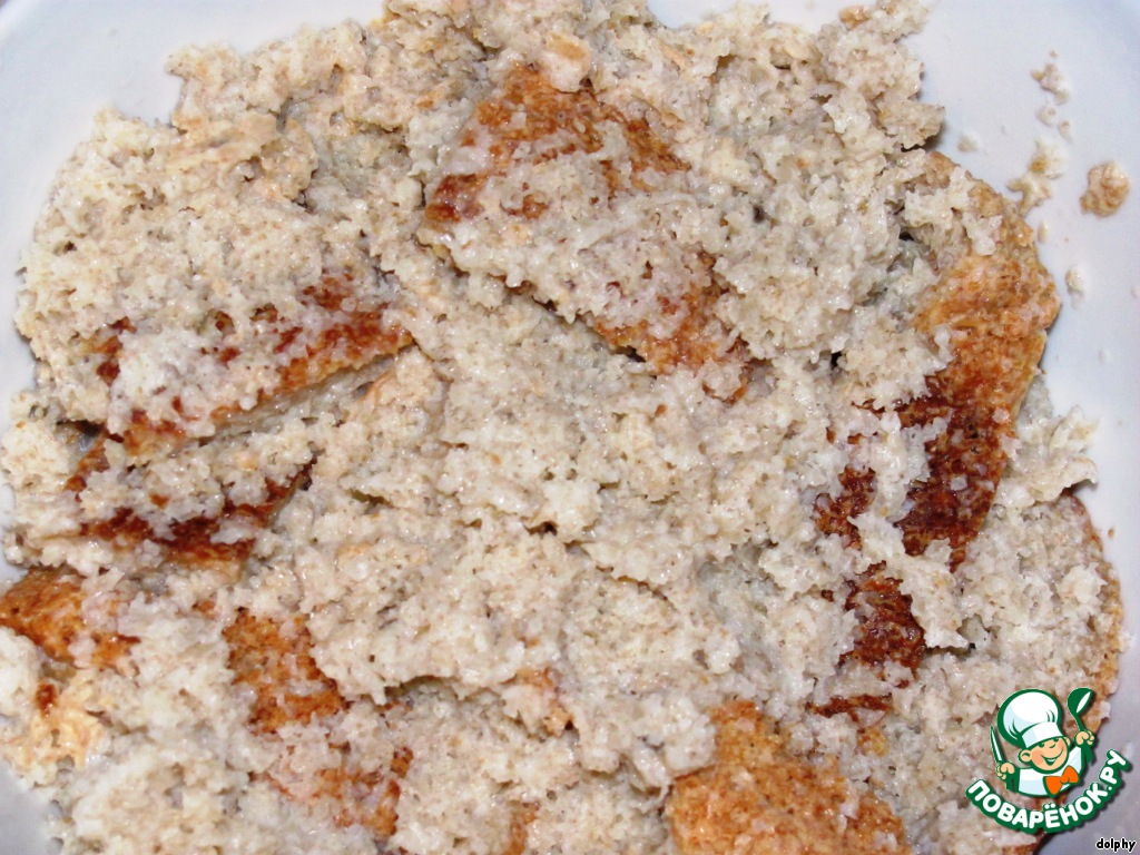 Хлеб залить молоком и оставить на некоторое время для размокания. В зависимости от свежести вашего хлеба молока может потребоваться чуть больше или меньше. После того, как хлеб размокнет, излишки молока отжать.