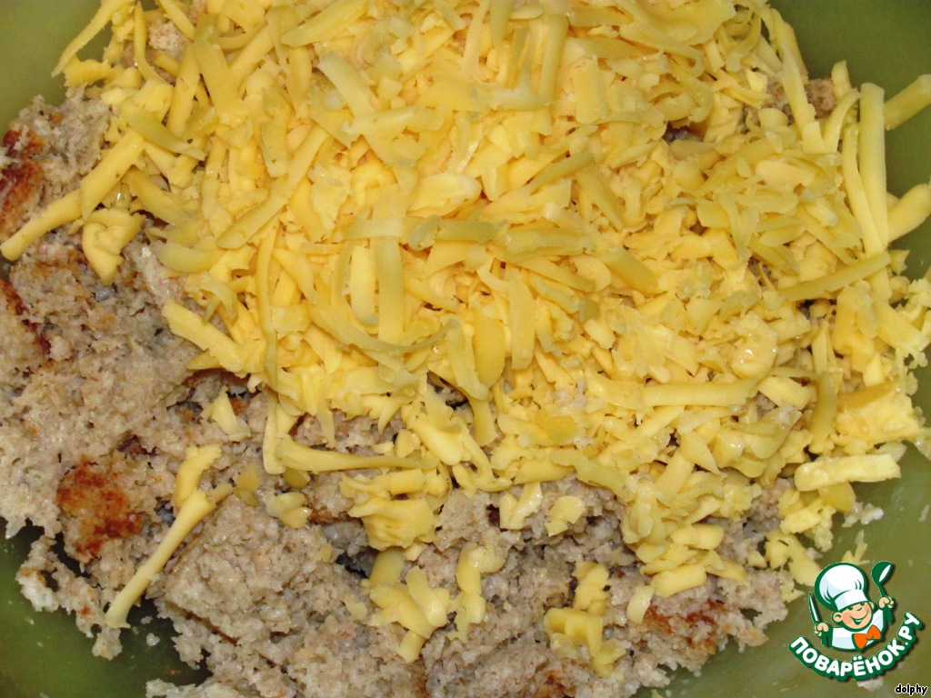 К хлебу добавить тертый сыр и яйцо, тщательно перемешать.