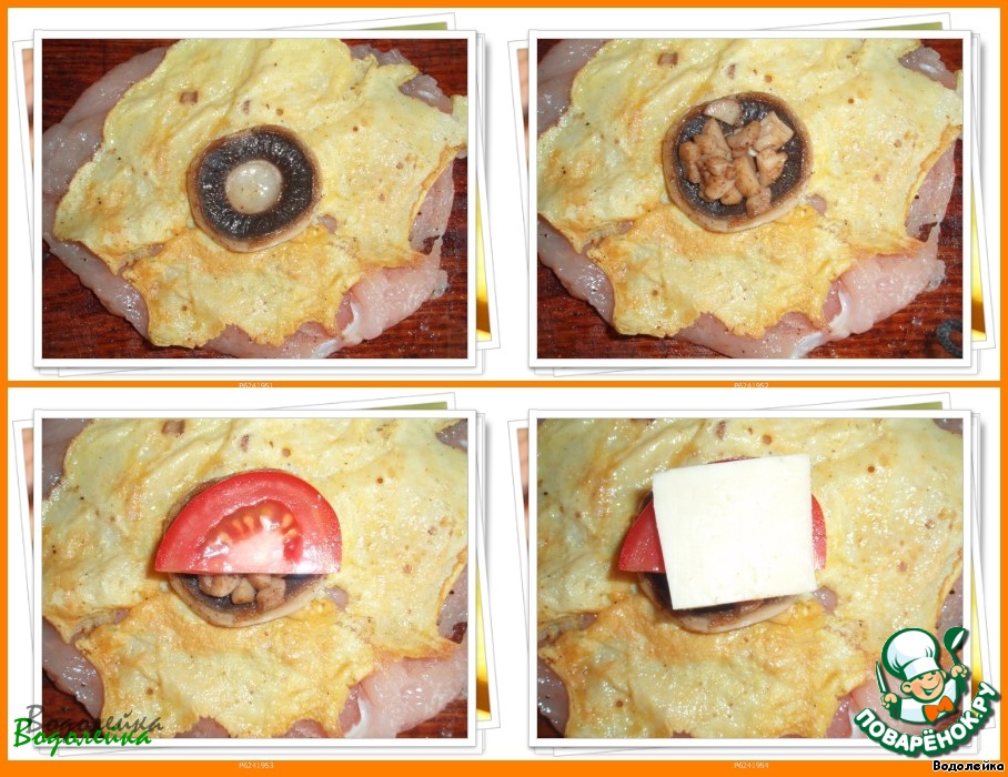 Теперь формируем наш мешочек: для этого берем филешку, кладем сверху омлет. В центр уложить шампиньон (шляпку). Теперь сверху кладем немного обжаренных грибов (это наши ножки), кусочек помидора и кусочек сыра.