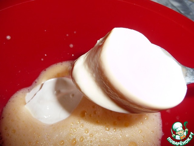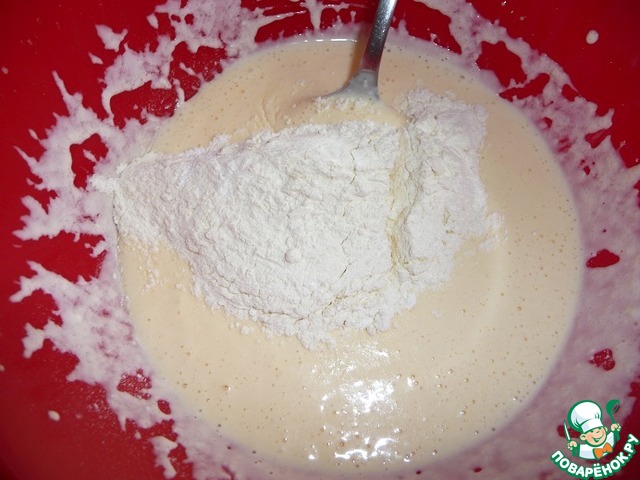 Муку смешать с разрыхлителем теста и добавить в тесто, перемешать.