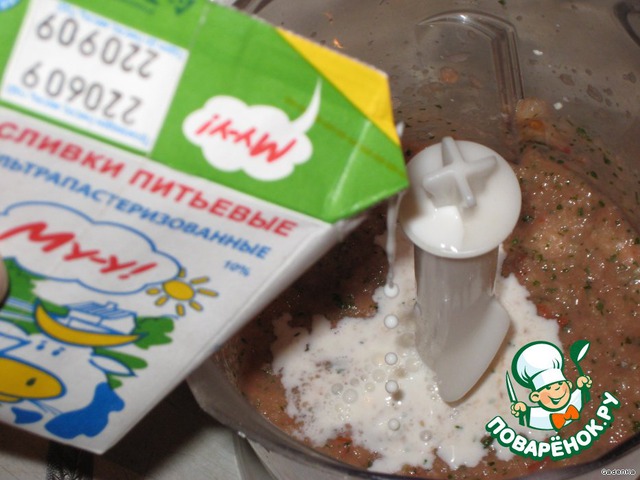 Затем добавить в смесь соль, смесь перцев, куркуму, паприку, молотый имбирь, томатную пасту, 2 ст.л. сметаны, сливки, все перемешать.