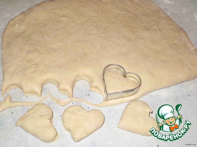 Хотела рюмкой, да края слишком круглые и толстые, тесто будет сильно придавливаться, оно очень мягкое и нежное, а формочки только в виде елочки и сердечка, ну и решила замутить дела сердечные )))