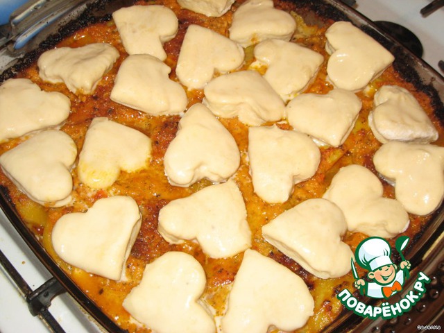 Достаем почти готовую курицу, поверх выкладываем наши пышки. Смазываем яйцом и отправляем назад в духовку еще на 15-20 минут,