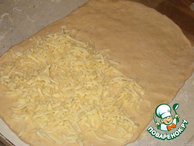 Сыр натереть на терке и выложить на половину прямоугольника.