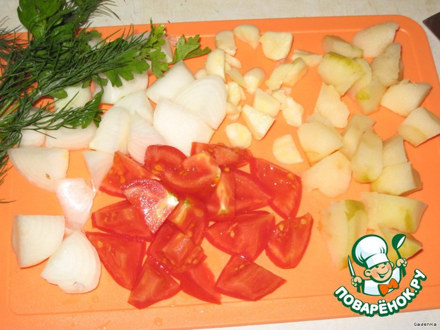 Порезать лук, яблоко, чеснок, помидор и сложить все это в комбайн, добавить укроп и петрушку и превратить все в пюре.