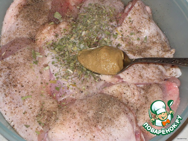 Курицу слегка посолить, поперчить черным перцем, добавить 1 ч.л. горчицы и прованских трав, или любых других сушеных (базилик, орегано, майоран, тимьян…), все хорошо перемешать и оставить на 1-2 часа.