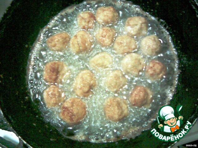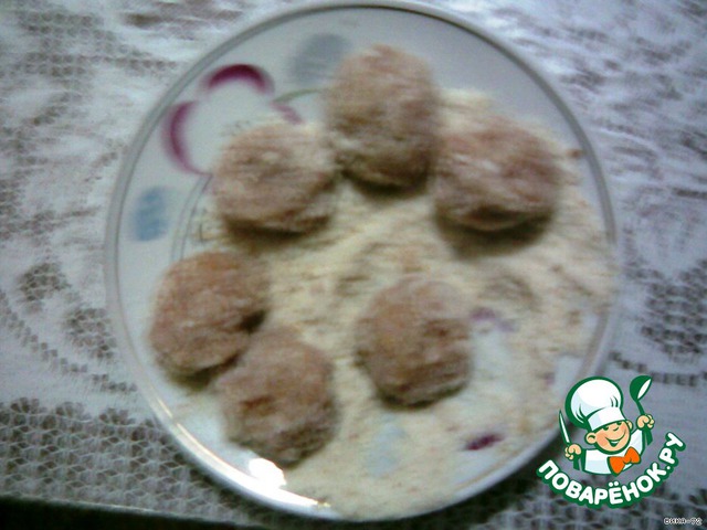 смоченными в холодной воде руками лепим маленькие тефтельки и обваливаем их в панировочных сухарях