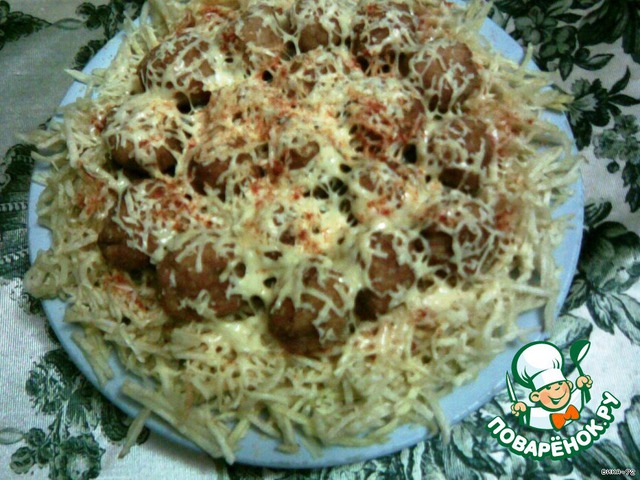 | Нежные румяные куриные тефтельки в сухарной корочке устроились в уютном гнездышке из картошечки и грибочков, припорошенные легким сырным снежком... |