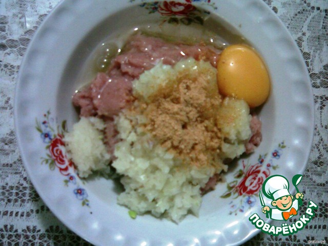 в фарш добавляем измельченный в блендере лук, яйцо, соль, паприку, приправу для курицы, хорошенько перемешиваем