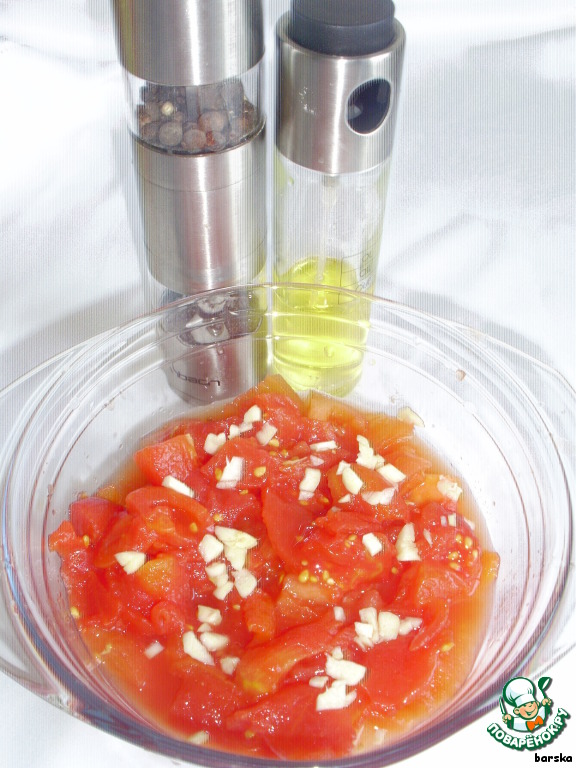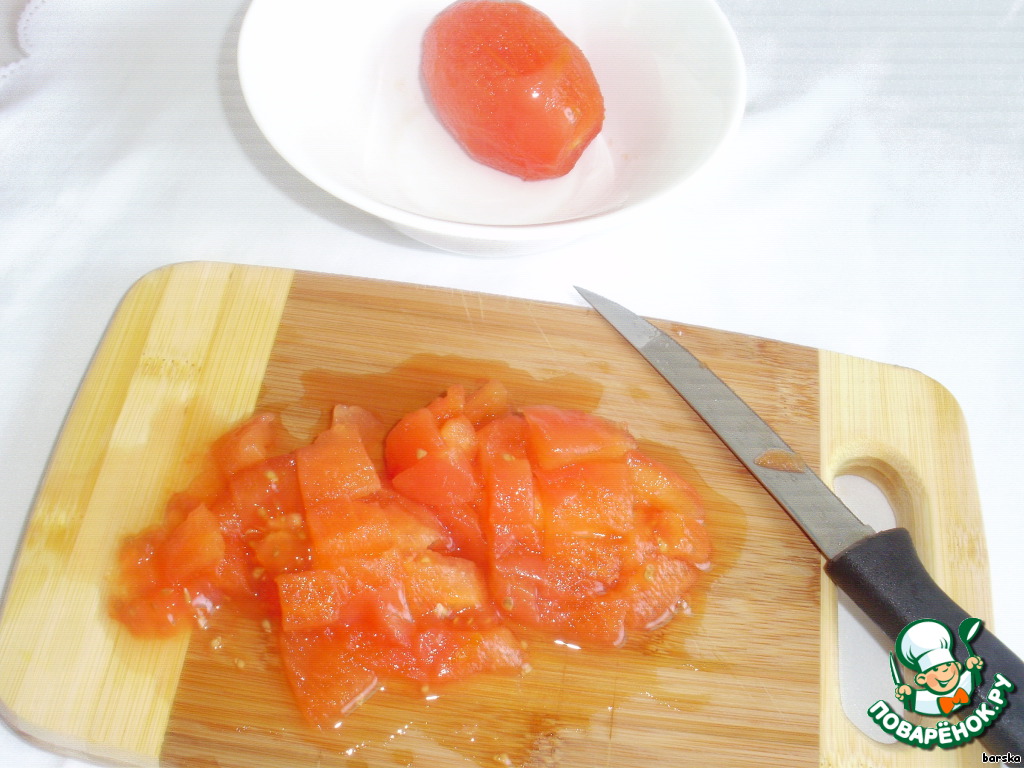 Помидоры без кожицы крупно порезать (можно - свежие, ошпаренные, можно - консервированные).