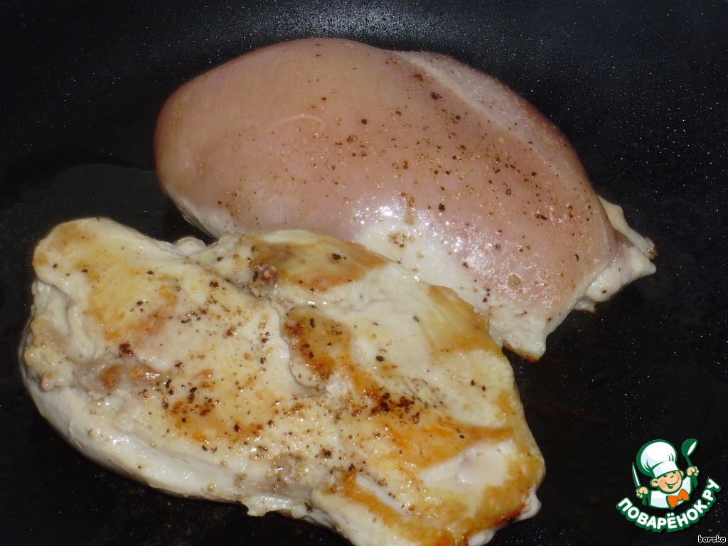 Куриные грудки помыть, обсушить бумажными полотенцами от лишней влаги, посолить, поперчить и обжарить в разогретом оливковом/растительном масле по 3-4 минуты с каждой стороны до румяной корочки.