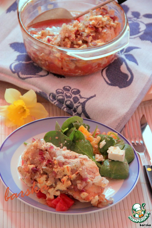 Достать из духовки форму с томатной сальсой, выложить сверху обжаренные куриные грудки и посыпать луково-брынзовой крошкой.