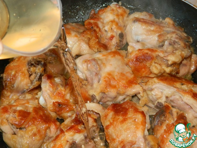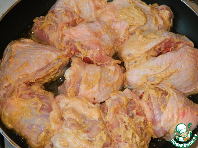 Курицу нарезать на порционные куски, обвалять в соусе и выложить на сковороду. Жарить на небольшом огне минут 20, не забывая переворачивать.