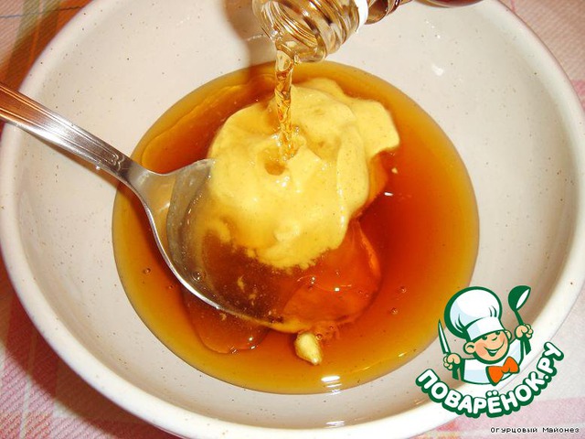 Начинаем с подготовки соуса. В мёд кладём горчицу и вливаем тёмный ром.