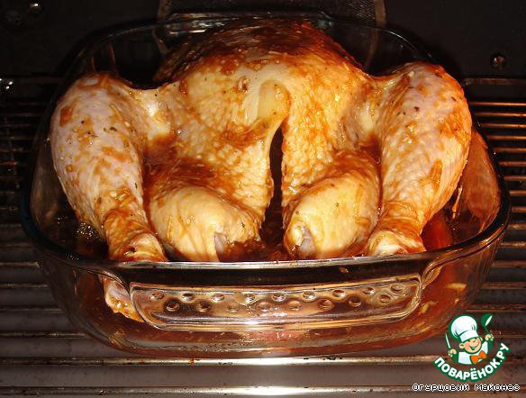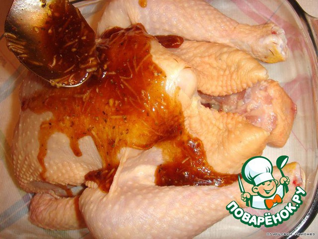 Курицу промываем, по необходимости очищаем от внутренностей и внешностей, выкладываем в глубокий огнеупорный лоток и поливаем со всех сторон приготовленным соусом.