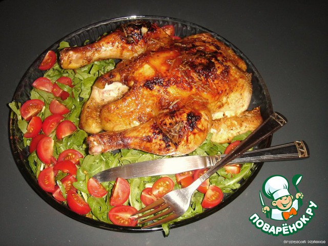 Готовую птицу выкладываем на блюдо и дополняем гарниром по желанию. В моём случае - это салат руккола с помидорками черри.