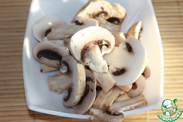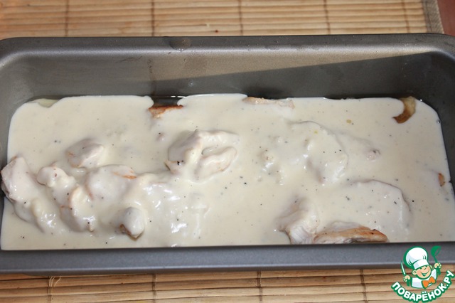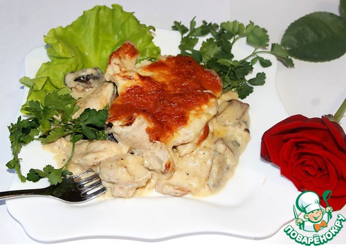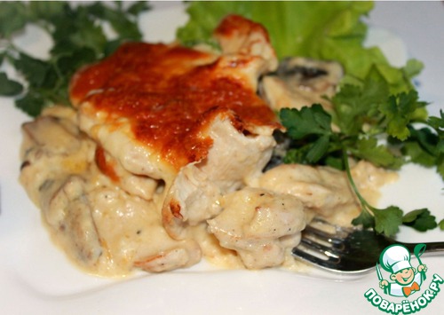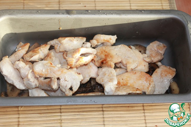 В форму выкладываем слоями: шампиньоны, сверху обжаренную куриную грудку
