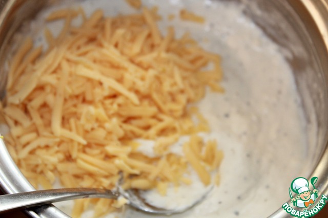 Муку смешиваем со сливками, чесноком, перцем, варим соус до загустения и добавляем тертый мягкий сыр (у меня гауда), размешиваем до расстворения сыра, добавляем оставшееся белое вино, хорошо размешиваем