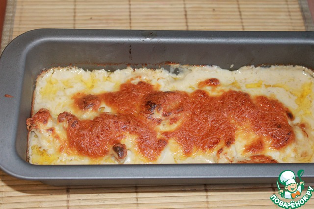 Заливаем сливочным соусом, посыпать порубленным миндалем и тертым пармезаном