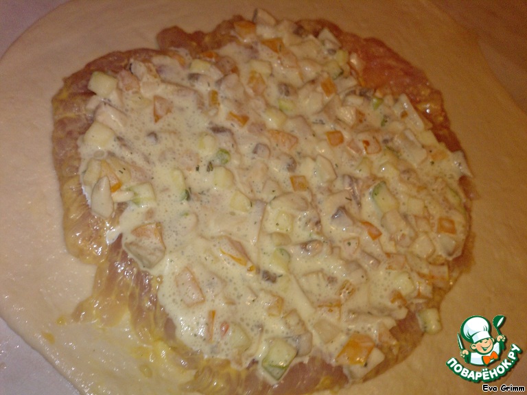 Свернем в рулет (вместе с тестом), защипаем края, чтобы наш овощной соус не вытек из "штруделя" :-P