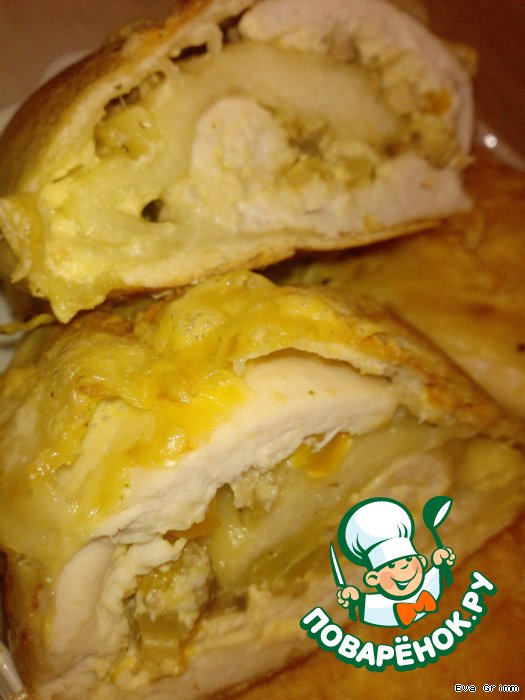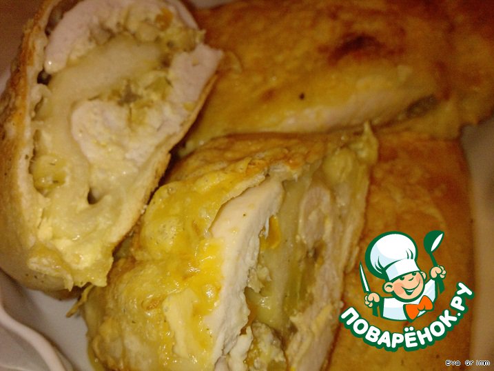 Куриную грудку отбиваем и маринуем в горчичном соусе+специи+лимонный сок по вкусу (маринад может быть любым на Ваш вкус)
