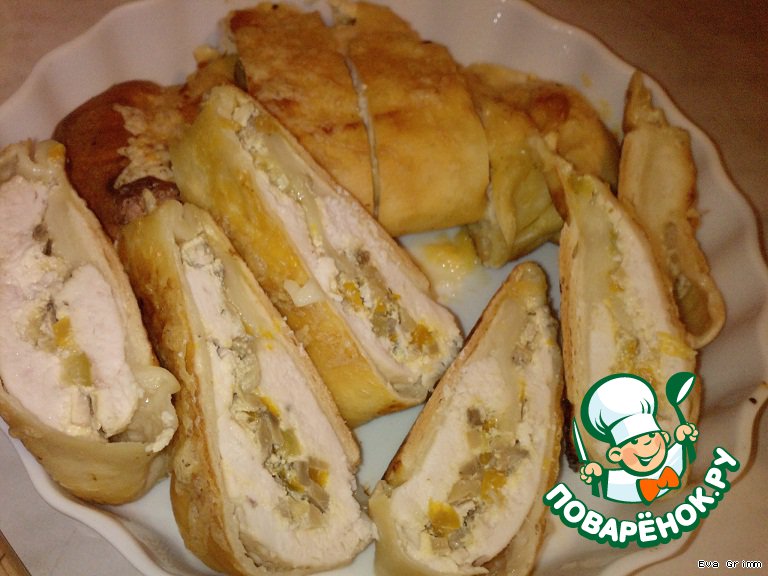 На каждый пласт теста выкладываем подготовленную грудку и слой начинки