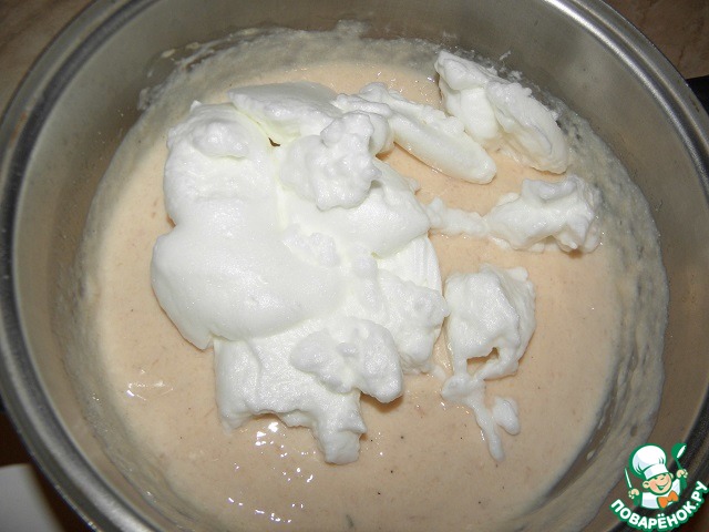 Белки взбить до густой пены с щепоткой соли, и аккуратно соединить с куриной массой