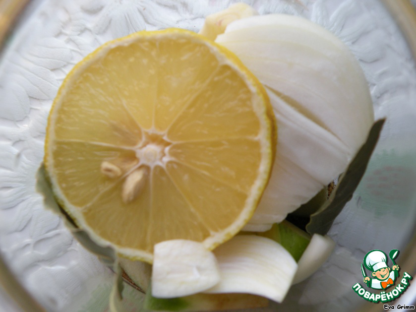 Приготовим банку... Приправу для мяса, нарезанное яблоко, чеснок, лук, лимон укладываем в баночку...
