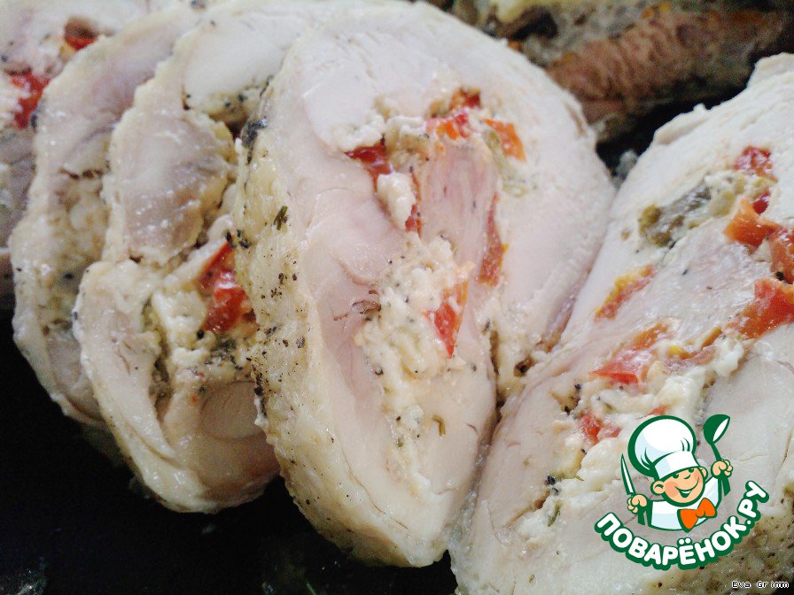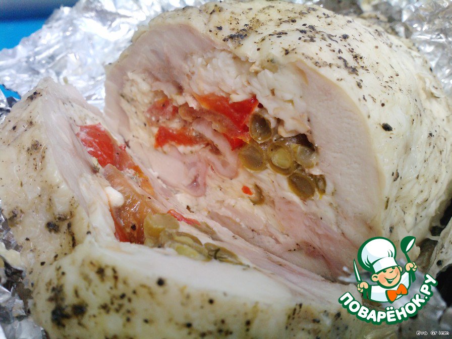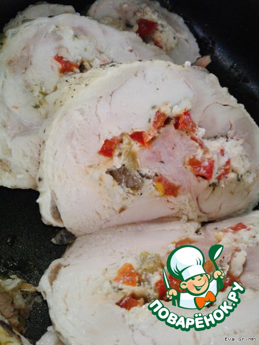 По одному краю (вдоль) подготовленной тушки выкладываем полоской овощи и сыры.