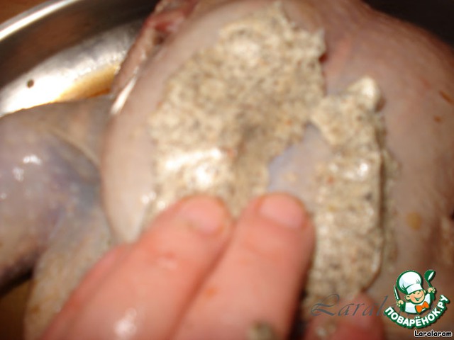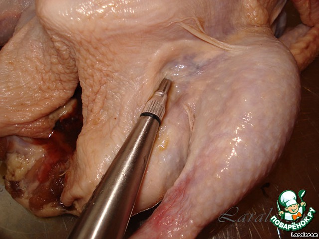 и вводим его под кожу и в мясо курицы.