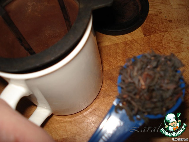 Готовим "коптильный" маринад: 4 мерных ложечек чаю (если таковых не имеется, возьмите чайными ложками БЕЗ горки!) заварить кипятком - около 150 мл, оставьте настаиваться до остывания, а можно и дольше...