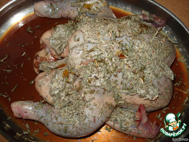 Запекаем при 200° около 1,5 часов. Следите, чтоб курица прожарилась хорошо... Большое содержание жидкости в куре удлиняет процесс готовки.