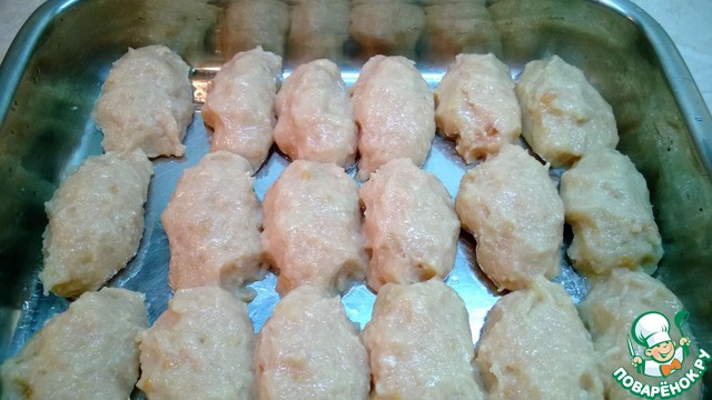Смазываем глубокий противень маслом. Формируем котлетки. Выкладываем на противень.