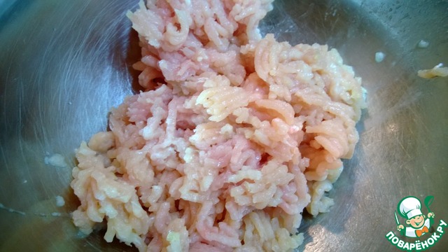 Прокручиваем куриное филе на мясорубке, добавляем яйцо, булочку, вымоченную в воде или молоке, мелко нарезанный лук, пол ст. л. горчицы, соль.