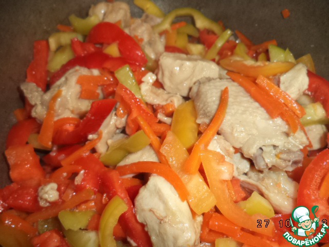 Нарезать лук мелко, морковку и болгарский перец — крупной соломкой, курицу — некрупными кусочками, чернослив порезать на 4 части, предварительно удалив косточку.