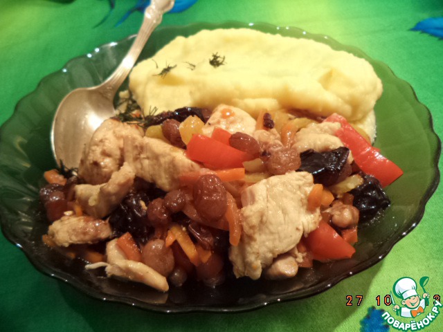 В конце добавить изюм и чернослив. Специи по вкусу. Пусть томится минут 10 при выключенной плите.