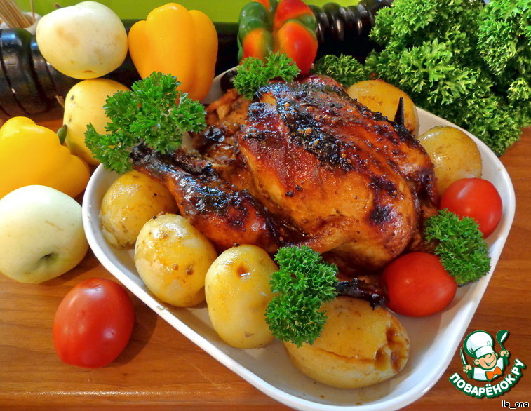 Эта курочка была также невероятно вкусна. Только я очень хотела, чтоб она дождалась мужа в духовке... поэтому она несколько более загорелая)))