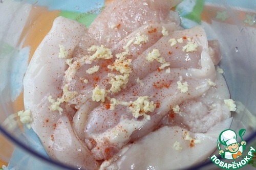 Куриное филе нарезать полосками, добавить измельченный чеснок, приправить.