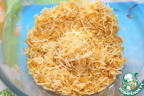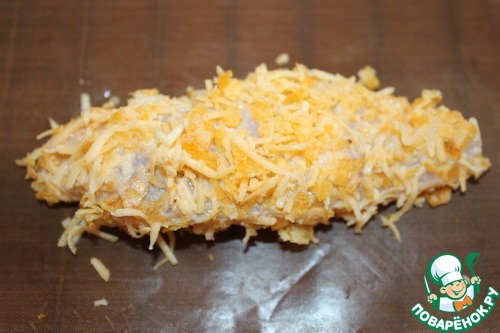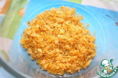 Обвалять замаринованное филе в панировке из сыра и чипсов.