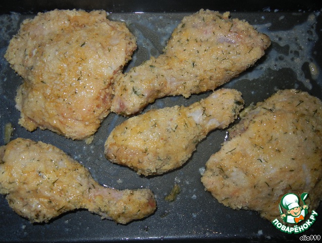 Разогреть духовку до 200 градусов, растопить в форме сливочное и растительное масло. Выкладываем кусочки курицы и немного поливаем маслом из формы. Запекаем в духовке на верхнем уровне, до золотистой корочки. Обязательно перевернув.
