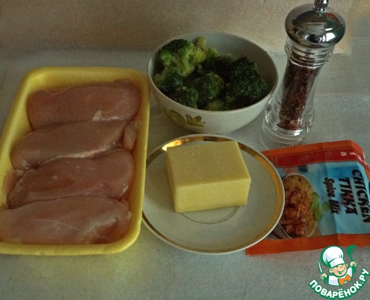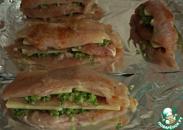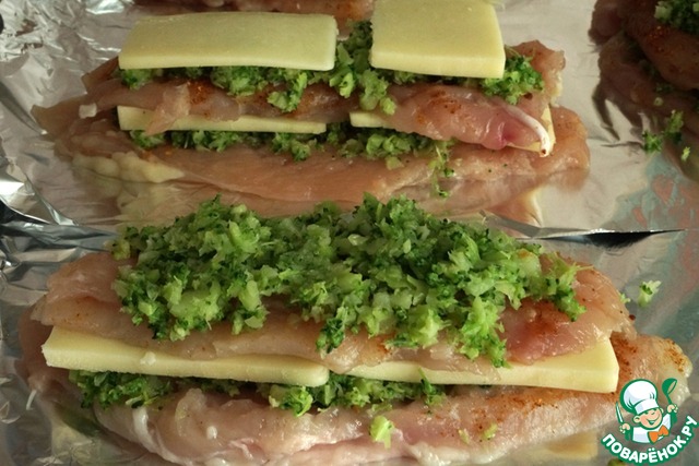 Далее выкладываем слоями на противень выстланный бумагой или фольгой: куриное филе, брокколи, сыр