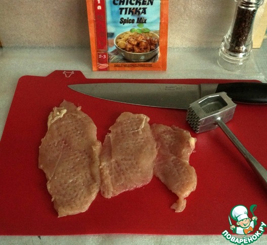 Каждое филе нужно разрезать на три части по плоской стороне, то есть получится три стейка. Слегка отбить, посыпать приправой для курицы. Пусть пока постоит, отдохнет.